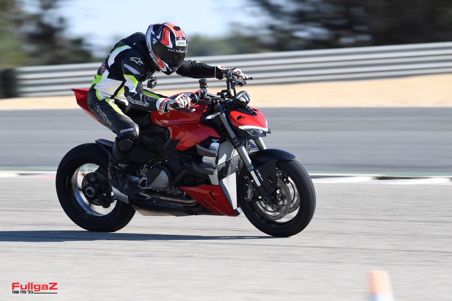 גם ההתנהגות הדינמית היא לחלוטין פניגאלה V2 – בטח ובטח על המסלול. ההיגוי זריז והחלטי, ויחד עם זאת הסטריטפייטר V2 יציב מאוד, ומאפשר לרוכב להתרכז בתכנון המשך המסלול. וזה נכון לא רק על מסלול המרוצים, אלא גם בכביש הציבורי. שינויי כיוון מתבצעים כמעט בכוח המחשבה בלבד, כשהכידון הרחב לחלוטין מקל על ההיגוי ביחס לפניגאלה, וכך גם תנוחת הרכיבה המעט זקופה יותר.