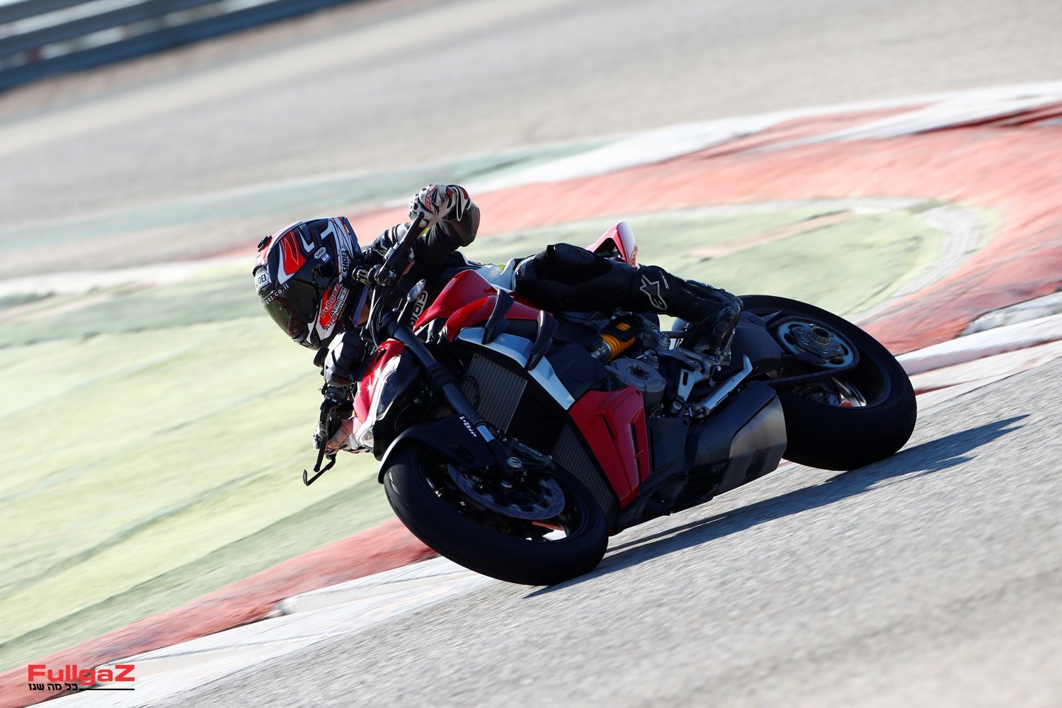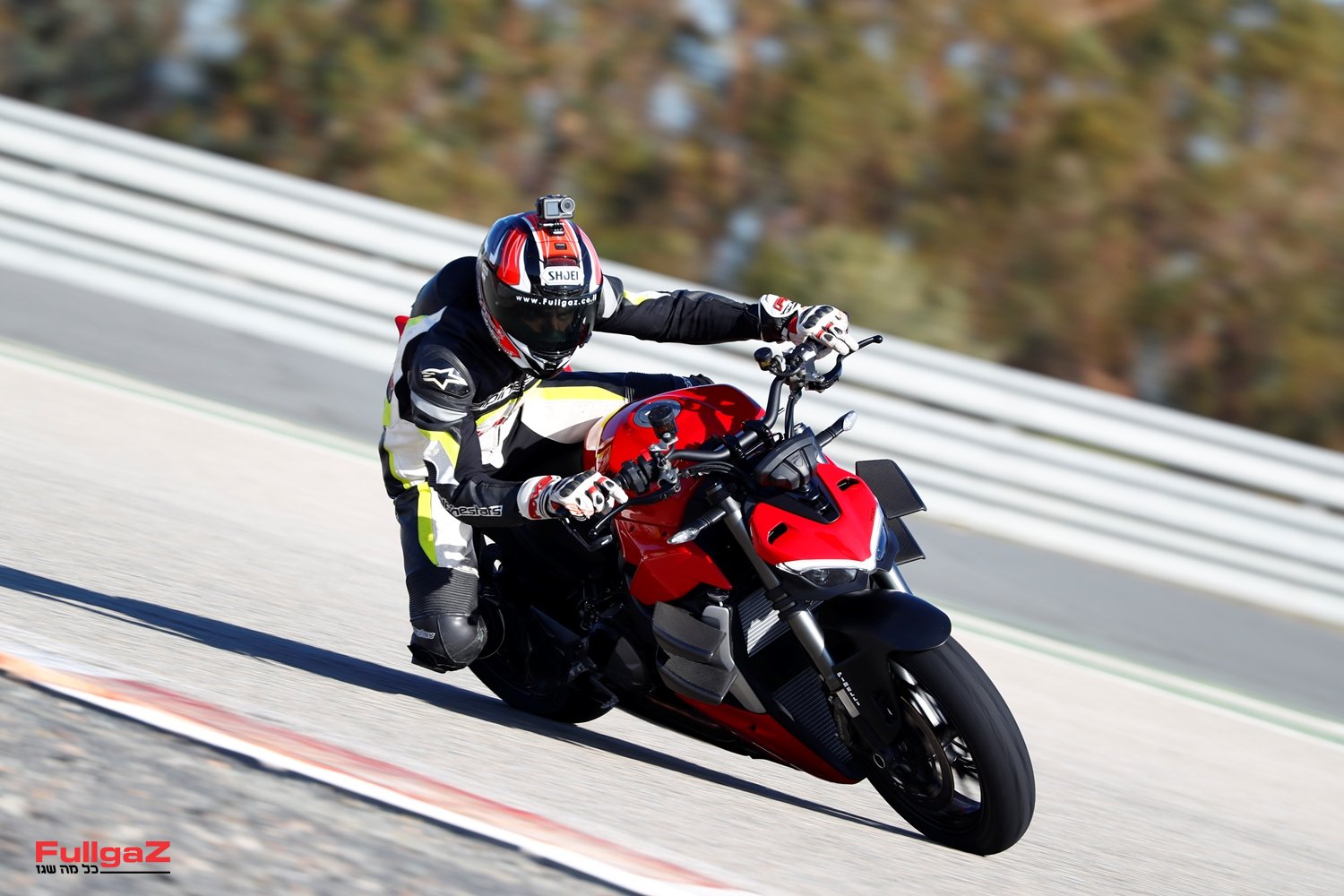 התאוצות, כמובן, משכרות, כשהסטריטפייטר V2 מוריד לקרקע את מלוא ההספק דרך כל ההילוכים, בזמן שהגז לא נסגר בזכות הקוויקשיפטר. תוך שניות הוא מגיע ל-200 קמ"ש, ועל הישורת הארוכה של מסלול מונטהבלנקו שבדרום ספרד ראינו 260 קמ"ש על מסך ה-TFT, כשלמנוע היה עוד מה לתת ורק פנייה מס' 1 המתקרבת אילצה אותנו לסגור את הגז ולעבור לבלמים. אלו, כצפוי, עוצמתיים ומלאי רגש. מערכת הבלימה פה זהה לחלוטין לזו של הפניגאלה V2, כשרק רפידות הבלם הוחלפו ל'עדינות' יותר, כדי שתספקנה קצת פחות עוצמת בלימה. ובכן, עוצמת בלימה זה הדבר האחרון שחסר בסטריטפייטר V2.