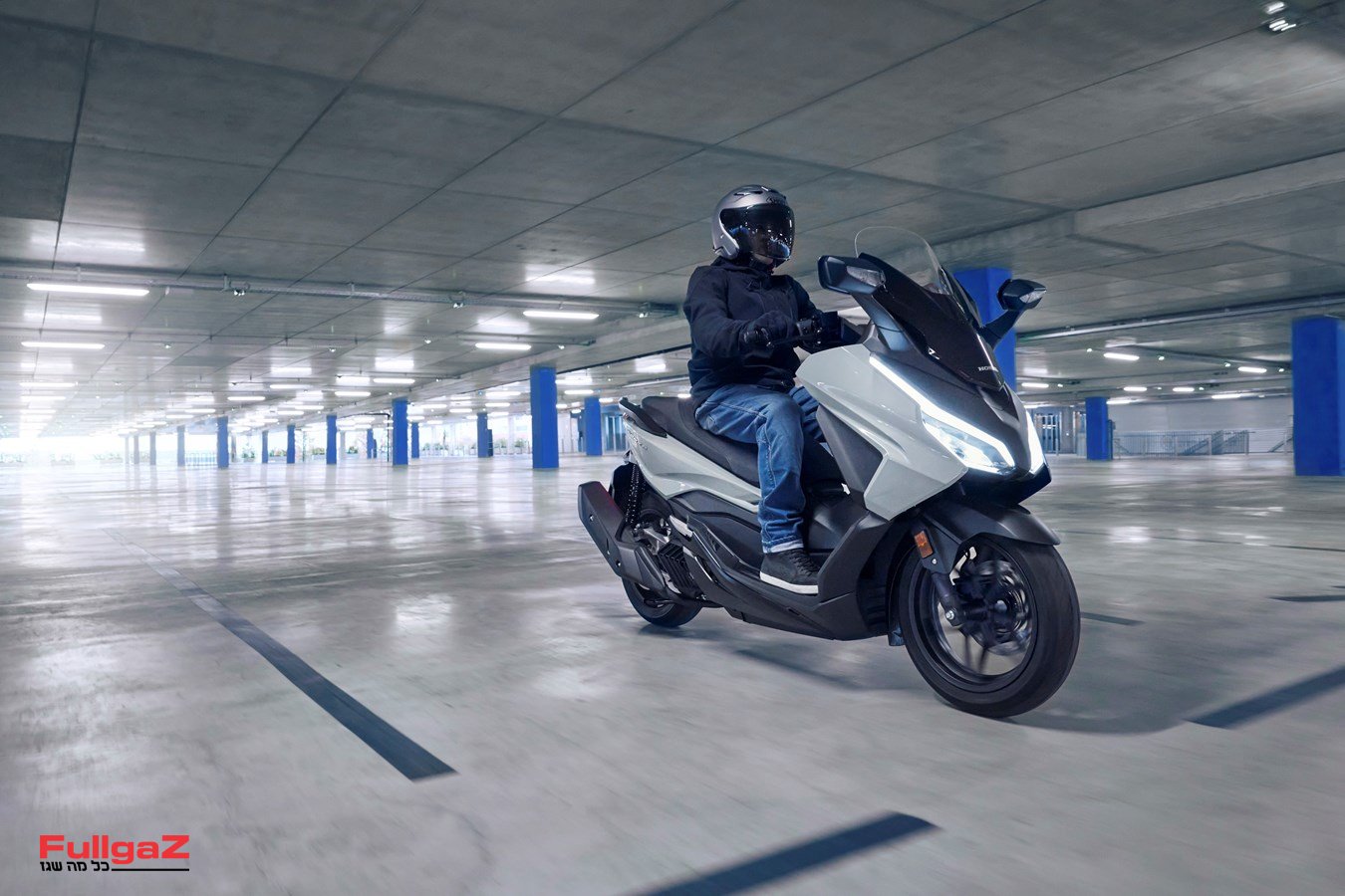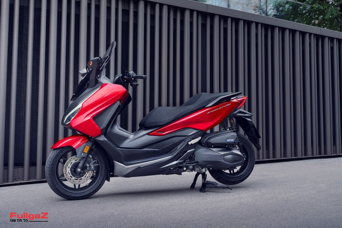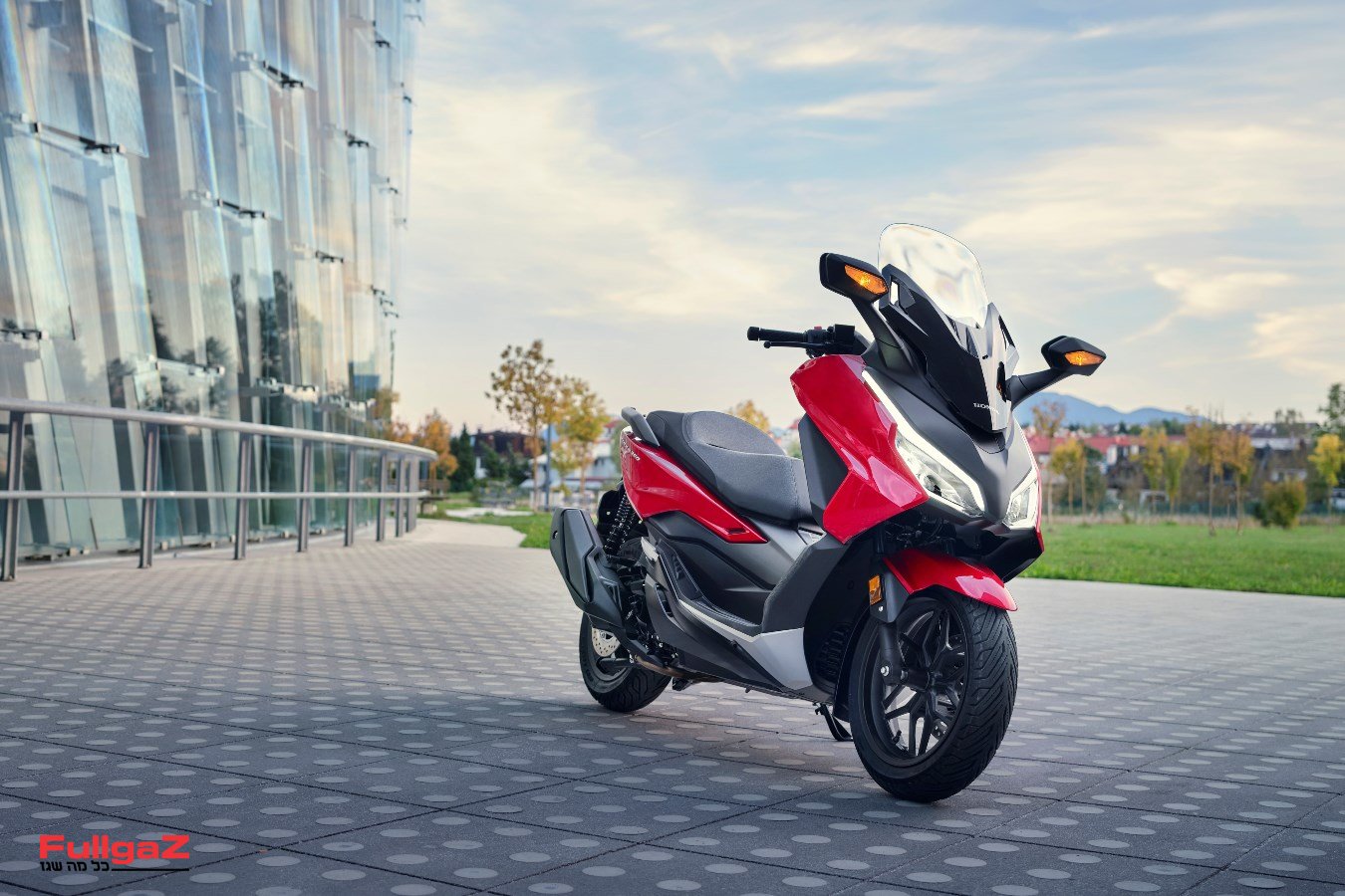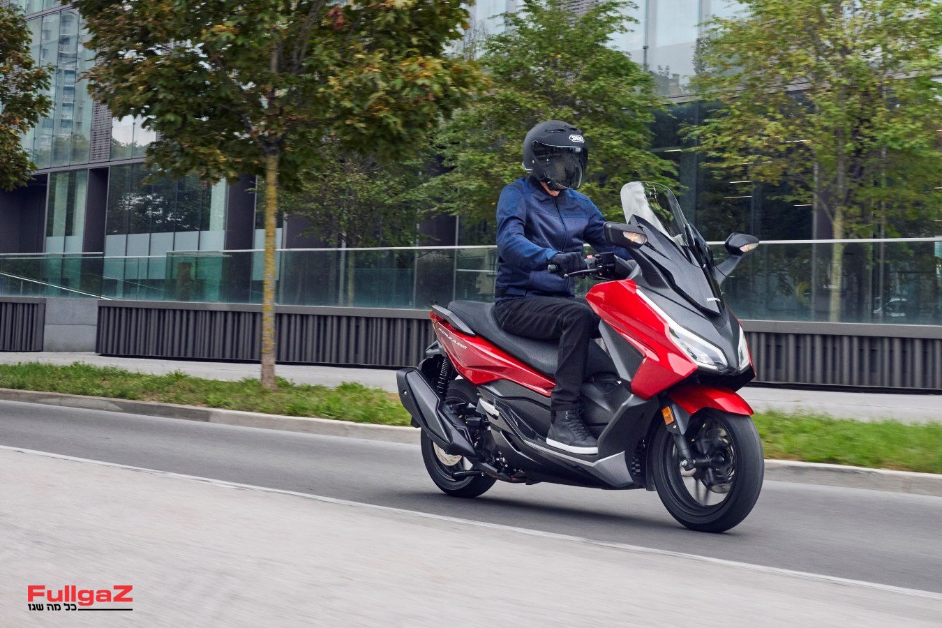 המושב החדש נוח יותר, כשניתן להחליף אותו במושב קומפורט לנוחות גבוהה יותר לאורך זמן. יש מקום רב יותר לרגליים, אבל השיפור המשמעותי נמצא בחזית: בהונדה ניפחו מעט את החזית, אבל בעיקר שיפרו את האווירודינמיות, וכעת זרימת האוויר מוסטת רחוק לצידי הכלי ומאפשרת לרוכב בועת ואקום סביבו. תוסיפו לזה משקף רוח חשמלי אשר במצב הגבוה שלו מספק מיגון רוח מעולה גם לגובה וגם לצדדים, ותקבלו סביבת רוכב נטולת רוח שמאפשרת נוחות גבוהה. זו אחת הנקודות המשמעותיות ששופרו בפורצה החדש של 2025, והיא הופכת את הפורצה ממקסי-סקוטר ספורטיבי למקסי-סקוטר ספורט-תיור – כלומר מרחיבה את טווח השימושים של הפורצה.