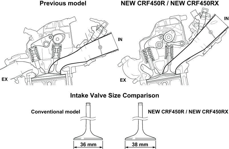 לא יהיה מוגזם להגיד שה-CRF450 החדש נבנה סביב המנוע החדש, וזאת מסיבה עיקרית אחת: בהונדה תכננו את המנוע, ובעיקר את מערכת היניקה, בתצורת 'דאונדראפט' – כלומר יניקת אוויר ישרה – ללא כיפופים – מתיבת האוויר ועד לתא השריפה. המבנה הזה מאפשר זרימת אוויר יעילה יותר, עם הרבה פחות הפסדים, וכפועל יוצא – שיפור בגרף המומנט כמעט לכל אורך העקומה (וגם כמובן – הספק גבוה יותר). לזה תוסיפו יחד דחיסה שגדל מ-12.5:1 ל-13.5:1, ותקבלו מנוע שחזק יותר לאורך כל טווח העקומה.