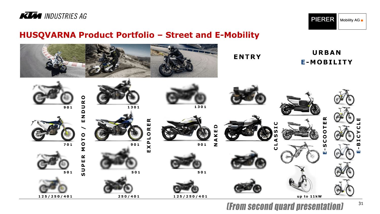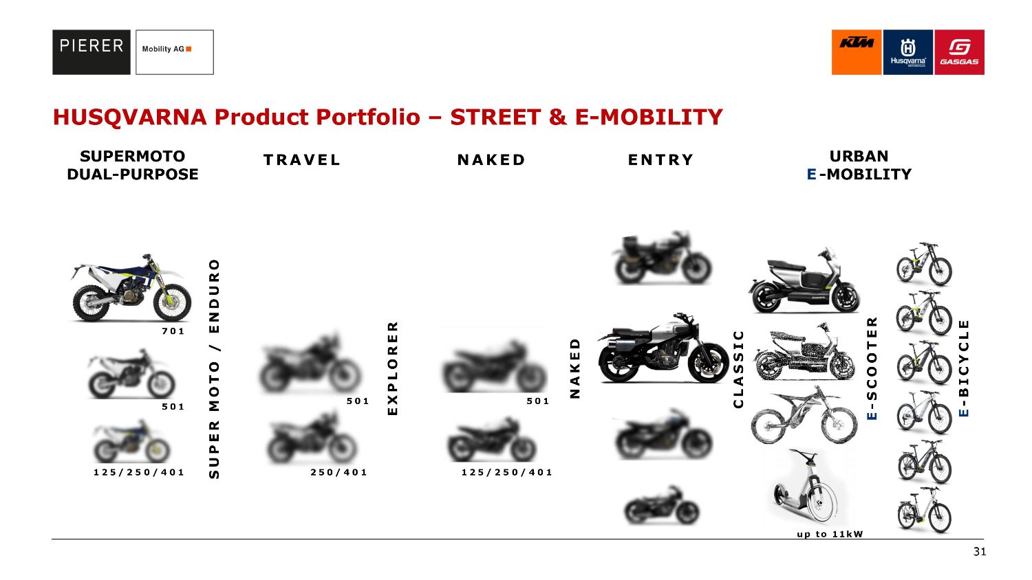 דגמי ה-401 הקיימים – הוויטפילן והסווארטפילן – יחד עם דגמי ה-250 ו-125 סמ"ק שיתווספו על בסיס הפלטפורמה, יקבלו עדכונים וחידושים. על-בסיס הפלטפורמה הזאת בהוסקוורנה יציעו גם משפחה של רטרו / קלאסי עם דגמי סקרמבלר, תיור, קפה רייסר ובובר – כלומר אותו המנוע, השלדה והמכלולים, כשרק העיצוב והאבזור שונים לכל דגם. בנוסף, בהוסקוורנה מפתחים אופנוע אדוונצ'ר על בסיס פלטפורמת ה-401, שיתבסס ככל הנראה על הק.ט.מ 390 אדוונצ'ר החדש.