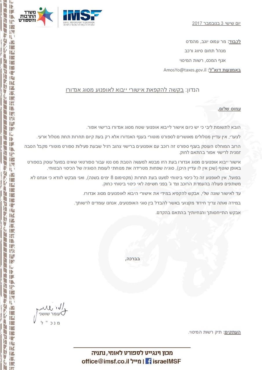 תגובת עומר שושני, מנכ"ל התאחדות הספורט המוטורי: "ההתאחדות במקרה זה אינה גוף מנחה כי אם גוף מקצועי ממליץ לגופים רגולטיביים, ביניהם הרשות לנהיגה ספורטיבית ורשות המיסוי. ההתאחדות נתבקשה להתייחס לסוגיה האם אופנוע אנדורו רשאי לפעילות ספורט מוטורי.