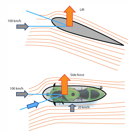 אז האם באמת ייתכן שזהו – מקדמי גרר נמוכים באמת פשוט בלתי אפשריים באופנוע? מה היה רע כל כך באותו פיירינג יעיל של המוטו גוצי V8 בן השישים? חלק גדול מהאחריות על הצורות הלא יעילות בעליל מוטל על תופעת הטבע שנקראת רוח, או ליתר דיוק – רוח צד, כזו שנושבת בניצב לכיוון הנסיעה. תעשו חשבון טריגונומטרי פשוט: אם אתם רוכבים במהירות של 100 קמ"ש קדימה ויש רוח צד של 20 קמ"ש, פירוש הדבר שווקטור הרוח האפקטיבי הפוגע באופנוע הינו בזווית של עשר מעלות, שזו בערך הזווית המיטבית שבה כנף של מטוס יוצרת עילוי. לא במטוסים עסקינן, אבל אם נסתכל מלמעלה על אופנוע סופר אווירודינמי שדומה לחתך של כנף מטוס, הרי שבתנאים אלו, אותה כנף אנכית תייצר כמות עילוי צידי לא מבוטלת שהרוכב ירגיש מיד בתור כוח שמסיט את האופנוע. אם יצא לכם לרכב בנגב ביום עם רוח ניכרת, אתם ודאי מכירים את התופעה. כל המרכיבים אשר יכולים לשפר את מקדם הגרר של אופנוע כמו פיירינג ארוך, בולבוסי וגבוה, זנב שמתמשך מאחורי הרוכב והאופנוע ועוד, יחמירו בצורה ניכרת את הרגישות של האופנוע לרוחות צד. ולראייה, הסיבה העיקרית להוצאתם של פיירינגים ענקיים כמו זה של הגוצי V8 מחוץ לחוקת מרוצי הגרנד-פרי נבעה מלא מעט תאונות שאירעו כאשר האופנועים הללו נתקלו ברוחות צד חזקות. פלא שרויאל אנפילד מיושן יהיה הרבה פחות רגיש לרוחות צד מאשר היאבוסה היפר טכנולוגי?
