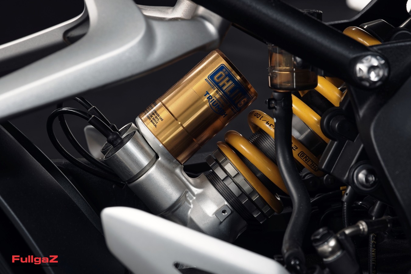 מערכת המתלים החשמלית של אוהלינס היא קסם, לא פחות, וכמו בכל האופנועים שבה היא מותקנת – היא מאפשרת שליטה על אפשרויות השיכוך בלחיצת כפתור ומעבירה את האופנוע ממצב נוחות רך למצב ספורט קשיח בכיוון פשוט ממסך ה-TFT הצבעוני. בנוסף, המערכת מתאימה את רמת השיכוכים תוך כדי רכיבה, בהתאם לכוחות שפועלים על האופנוע, כך שרמת היציבות והאחיזה גבוהה ביותר. זו כנראה מערכת המתלים האיכותית ביותר שיש כיום בכלים סדרתיים, והיא מרחיבה את טווח השימושים של כל אופנוע שבה היא מותקנת – גם של הספיד טריפל RR.
