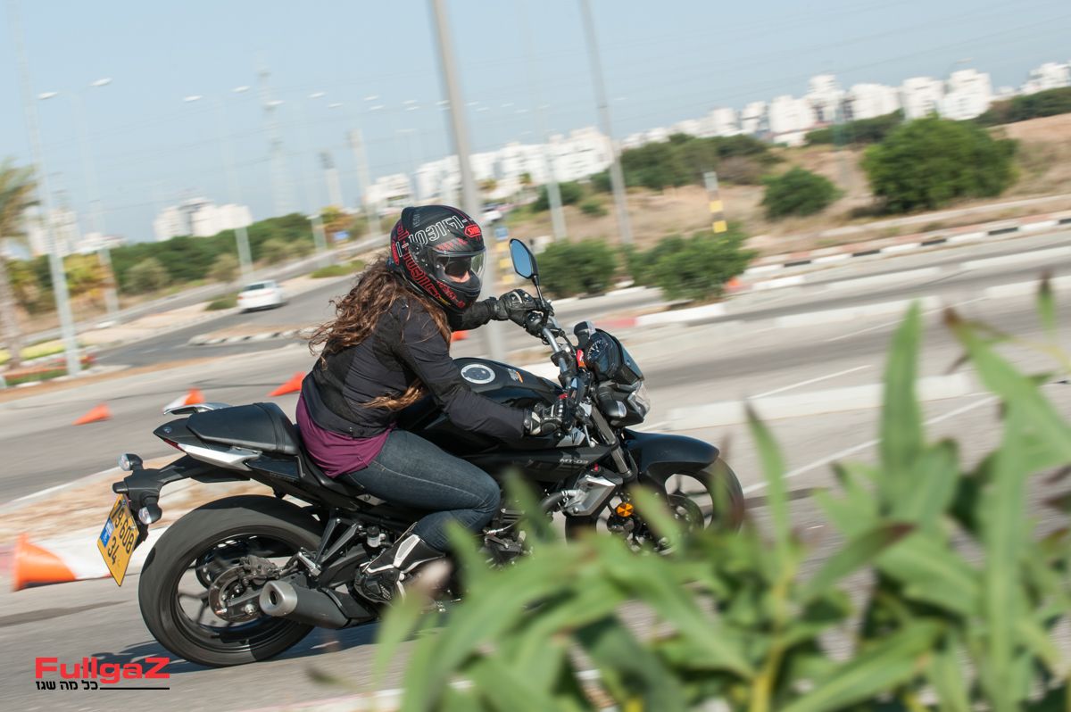 בעודי מסתובבת סביב התוואי שסומן על המגרש התחלתי כבר להרגיש את רגשי ההיקשרות הראשוניים למכונה הזו, שבאו לביטוי במיוחד בתחושת האבל הקטנה שהאופנוע הזה לא שלי. שהוא חוזר לסוכנות ולמעשה אחרי האימון הזה אצטרך לחזור ולהתאמן ב'מסלול' עם מפלצת זוללת סל"ד ודלק. לאט לאט, תוך כדי הקפות, בהטיה, כבר גיבשתי עם עצמי תכנית עסקית בה העוסקים בהדרכות רכיבה וימי אימון כאלו יחזיקו צבא קטן וחזק של 03MT-, ואנחנו נגיע אליהם על אופנועי הליטר שלנו, נחנה אותם בצד, ונעלה על צעצוע כזה שעושה עבודה כל כך מדויקת. זה נשמע לי רעיון כל כך מוצלח, הרי הוא יעשה מה שיעשה כל ספורטיבי קטן, אבל בלי הבולשיט. אופס, מתנצלת שוב, בלי הפיירינג, אז גם לא נורא אם מפעם לפעם הוא יביא אותה באיזו החלקה. בסוף החלטתי לא לדרוש על הרעיון זכויות יוצרים ולכתוב אותו קבל עם ועדה. רק אל תשכחו איפה שמעתם את זה בפעם הראשונה.