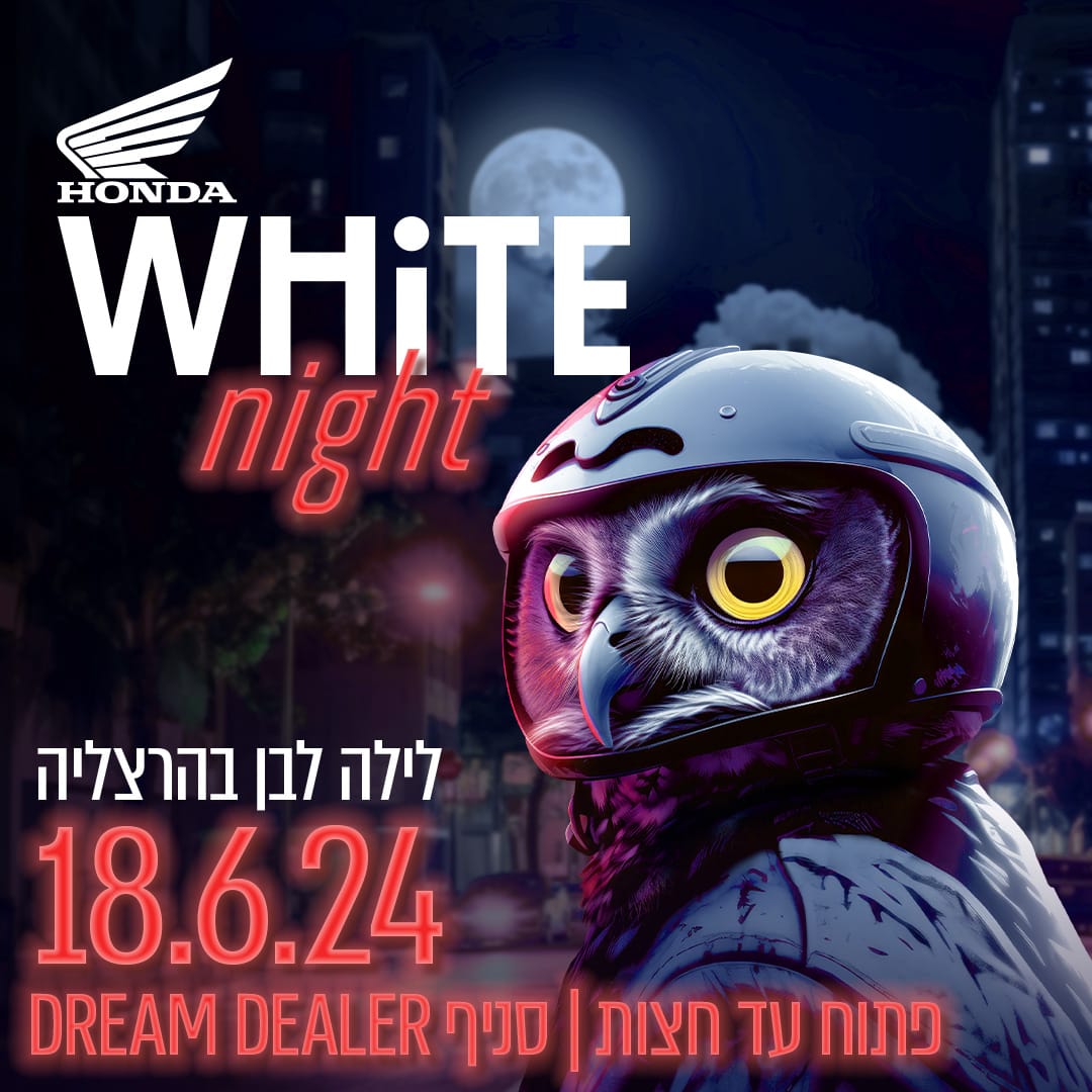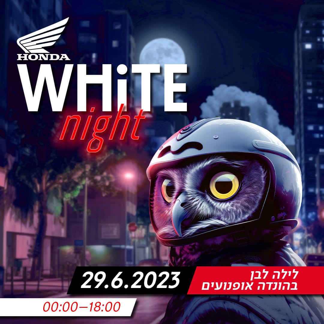 בחמישי הקרוב, 29.6.23, החל מהשעה 18:00 ועד חצות, תקיים הונדה את הלילה הלבן המסורתי – הפנינג מכירות עם הנחות על אופנועים וקטנועים, וכן על ציוד רכיבה והלבשה לדו-גלגלי.