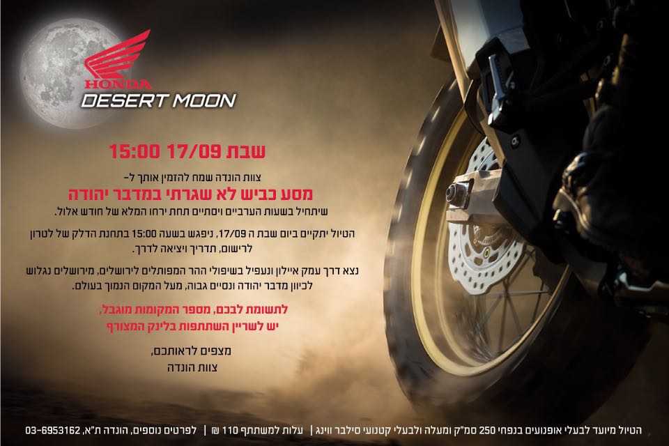 בשבת הקרובה, 17.9.16, תוציא מאיר – יבואנית הונדה לישראל, טיול ערב מיוחד לכבישי מדבר יהודה. הטיול יתחיל ב-15:00 בלטרון ויסתיים ב-22:00 במדבר יהודה, בתצפית מיוחדת על ים המלח לאור ירח מלא וארוחת ערב תחת כיפת השמיים.