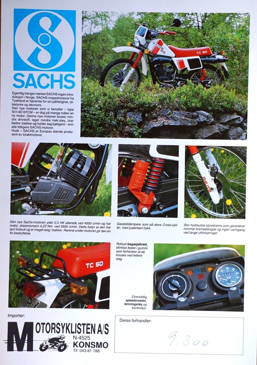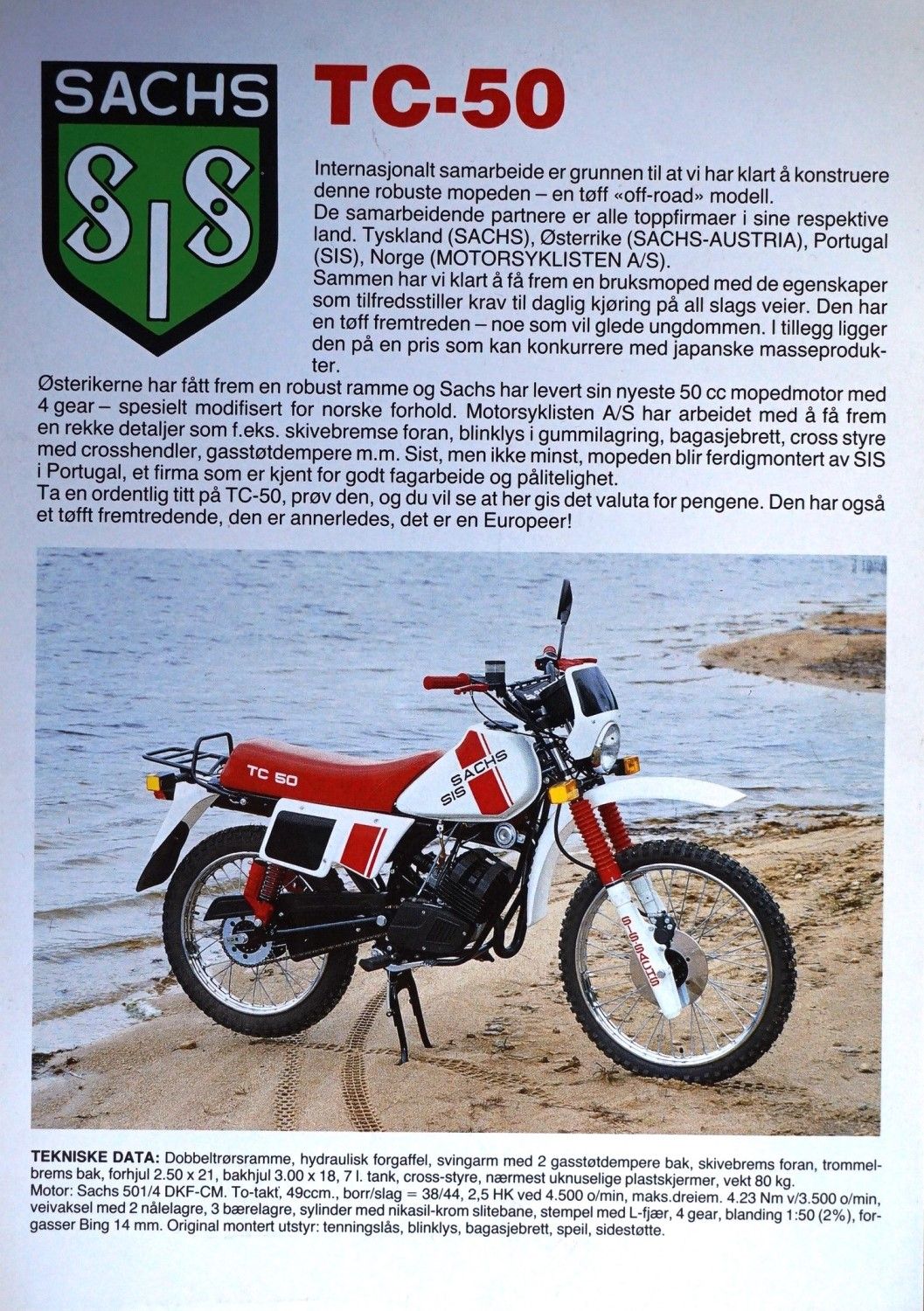 מדובר למעשה על אופנוע מתוצרת SIS (ר"ת Sociedade Irmãos Simões) – חברה שנוסדה בפורטוגל בשנות ה-50 של המאה הקודמת. החברה, שכבר הספיקה להסגר בשנת 1995, השתמשה גם במנועים של חברת זקס (Sachs) הוותיקה מגרמניה שנוסדה אי-שם בשנת 1886 [ועדיין קיימת (!) – ראו כאן]. אם נתמקד ב-TC50, אזי הוא יצא בתחילת שנות ה-80 והגיע לישראל במספרים קטנים בשנת 1984 ו-1985. המרכיבים של מתכון הקרוס כבר מוכרים: מנוע שתי פעימות מקורר אוויר בנפח 49 סמ"ק, חישוק קדמי בקוטר 21″, אשר הגיע באותם השנים עם בלם דיסק – בהחלט לא משהו שכיח בשנות ה-80, צמד בולמים אחוריים, ולוח שעונים מרשים ומפורט. אין נתונים מדויקים של המנוע, אך אנחנו מדברים על סביבות 7 כוחות סוס שמשכו אותו יפה אל כ-100 קמ"ש ואף מעט יותר.