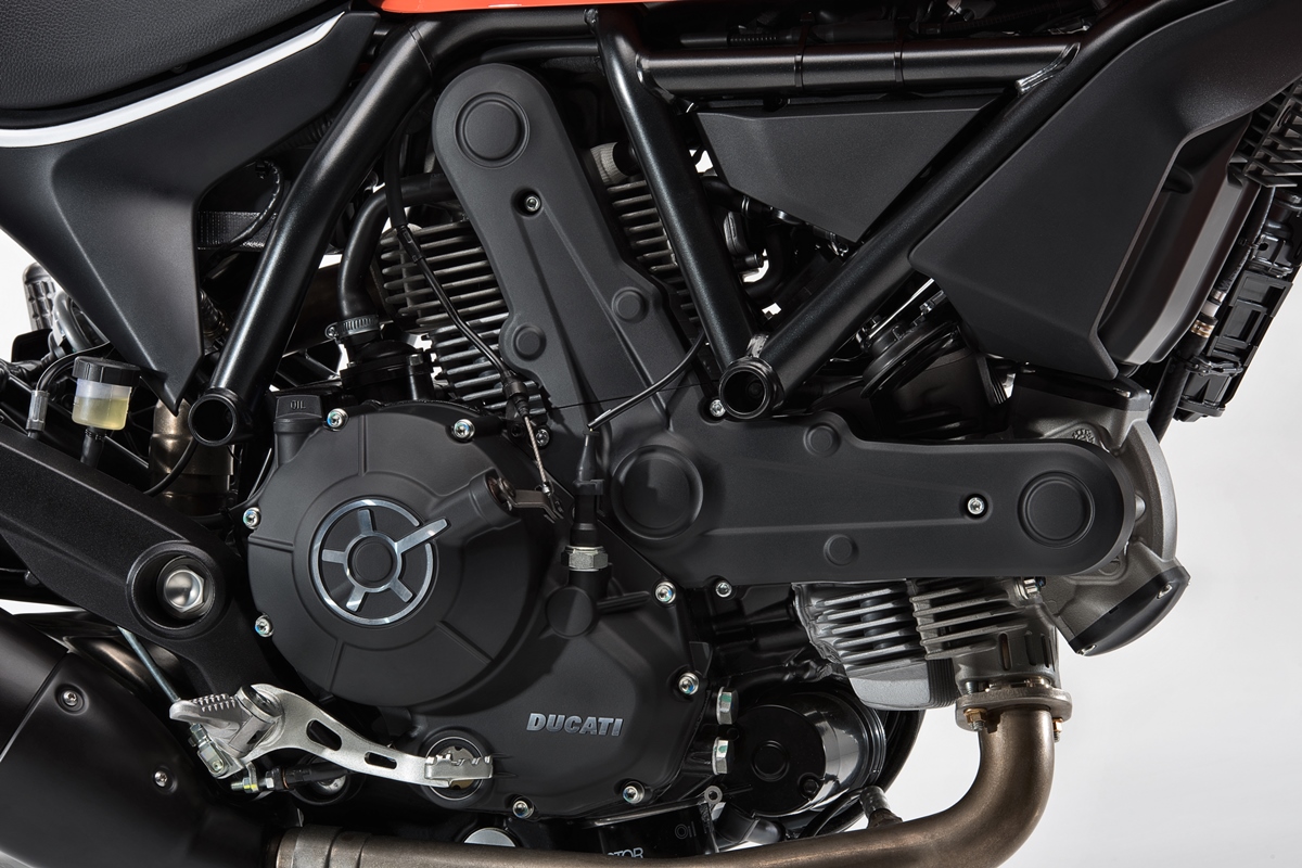 ובכן, בבסיס האופנוע כאמור וי-טווין מקורר אוויר עם 2 שסתומים לצילינדר ומנגנון דזמו, שבמקור מגיע מגרסת ה-800/696 וכאן נבנה מחדש. קוטר הצילינדר עומד על 72 מ"מ לעומת 88 מ"מ ב-800, ומהלך הבוכנה על 49 מ"מ לעומת 66 מ"מ ב-800. התוצאה היא נפח של 399 סמ"ק במקום 803 סמ"ק. ההספק המרבי עומד על 41 כ"ס צנועים ב-8,750 סל"ד, והמומנט 3.5 קג"מ ב-7,750 סל"ד. האופנוע כמובן מוזרק, עם גופי מצערת בקוטר 50 מ"מ – כמו בסקרמבלר 800.