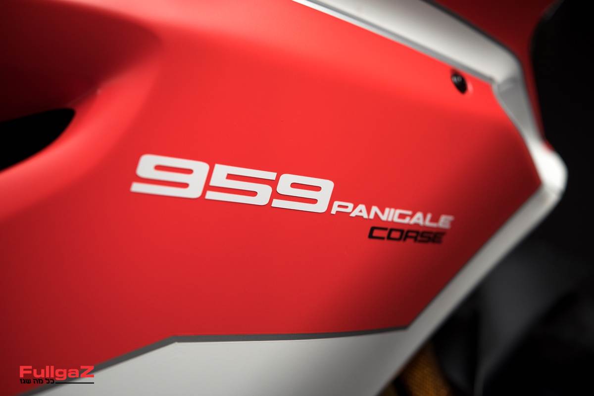 גרסת הקורסה של הפניגאלה 959 מגיעה עם בולמי אוהלינס איכותיים – NIX30 מלפנים ו-TTX36 מאחור, מתכווננים באופן מלא כמובן, משכך היגוי מתכוונן של אוהלינס, מערכת פליטה של אקרפוביץ' מטיטניום, מצבר ליתיום-יון, ומשקל נמוך יותר ב-2.5 ק"ג ביחס לפניגאלה 959 הרגיל – 197.5 ק"ג כולל נוזלים. בנוסף, הפניגאלה 959 קורסה מקבל סכמת צביעה בהשראת אופנועי ה-MotoGP של דוקאטי.