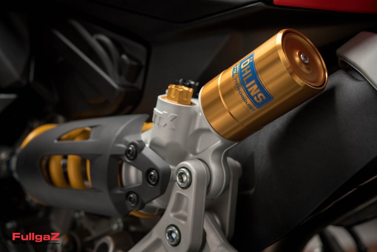 השלדה החדשה קצרה מקודמתה – לטענת דוקאטי על מנת לחסוך במשקל, יש בולמים סופר-איכותיים של אוהלינס (בגרסת ה-S), מערכת בלמים חדשה של ברמבו, אבל העיקר פה זה הבקרות האלקטרוניות המרובות. בנוסף למערכות המוכרות כמו בקרת החלקה או בקרת בלימת מנוע, כעת מתווספות כמה בקרות מאוד מעניינות: יש מערכת ABS לפניות, הכוללת גם בקרה על החלקת הגלגל האחורי לפניות – כך שמעתה ניתן להיכנס לפניות בהחלקת אחורי ללא חשש, ויש בקרת החלקת גלגל אחורי בתאוצה. המשקל עומד על 174 ק"ג יבשים בלבד. חידוש נוסף הוא הצמיג האחורי, שכעת הוא במידה 200/60ZR17 – המידה של אופנועי אליפות העולם בסופרבייק. הצמיג הזה – פירלי דיאבלו רוסו סופרקורסה, פותח יחד עם פירלי במיוחד עבור הפניגאלה V4.