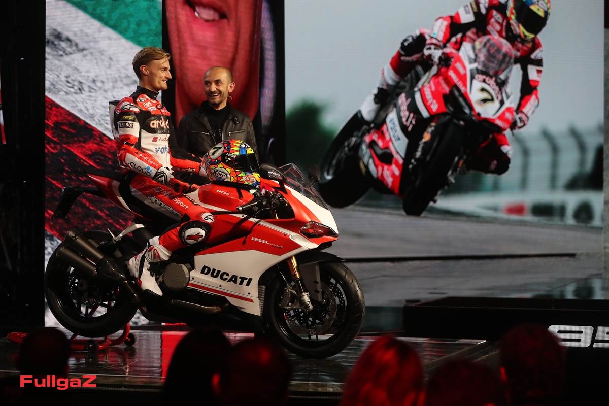 קלאודיו דומיניקלי – מנכ"ל דוקאטי – עם הפניגאלה V4 ספציאלה ושאר הכלים שהוצגו הערב