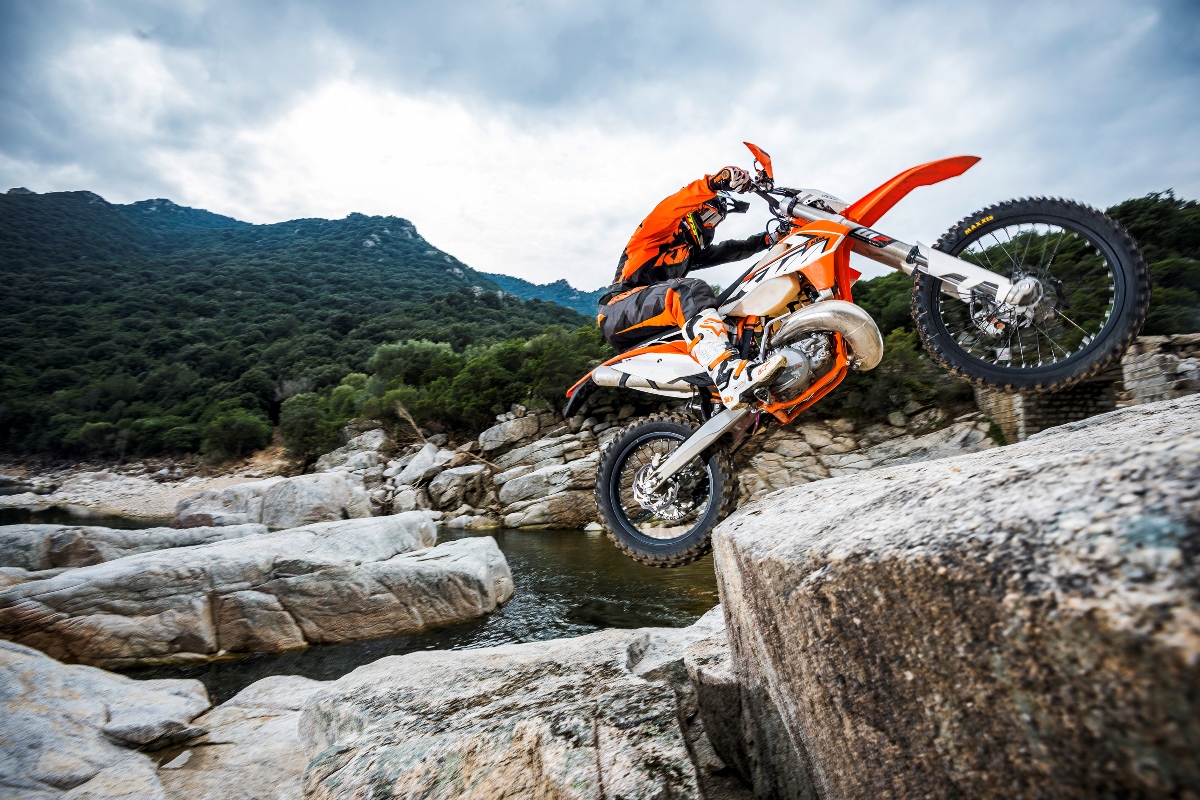 במעבר חד לשטח. מנוע ה-300 הדו-פעימתי של ק.ט.מ עבר בשנים האחרונות אבולוציה מרשימה (כמו כל מנועי הדו"פ של החברה). הוא עודן, הוחלק, נעשה נעים לשימוש ומציע ים של מומנט שימושי כבר מסל"ד רצפה. הוספת ההילוך השישי ב-2011 גם כן שדרגה אותו והפכה אותו למגניב יותר. אז ב-3,000 סל"ד הוא מכונת מומנט נשלטת, אבל כשמפרקים את הגז מקבלים בקצה הסקאלה פצצת כוח עוקרת עיניים. לא סתם הוא הבחירה של כל רוכבי האקסטרים-אנדורו.