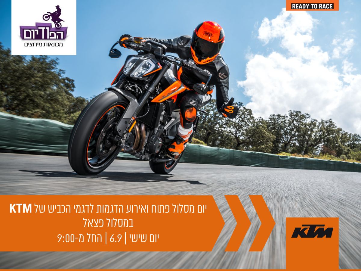 ד.ל.ב מוטוספורט, יבואנית ק.ט.מ לישראל, בשיתוף מוסך הפודיום, יקיימו בשישי הבא, 6.9.19, החל מהשעה 09:00, יום מסלול בפצאל לרוכבי כל המותגים ובמחיר מסובסד. במסגרת יום המסלול ניתן יהיה להתנסות על המסלול בדגמי הכביש של ק.ט.מ שיוצעו לנסיעות מבחן – ללא עלות.