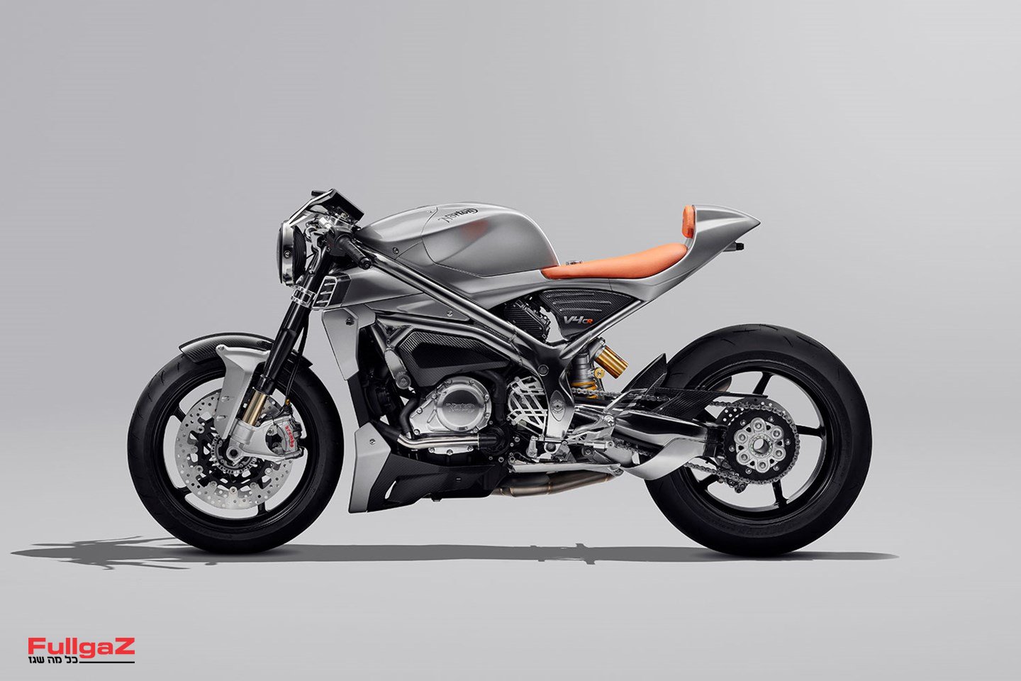 הדגם השני הוא גרסת קפה רייסר / נייקד של הסופרבייק, בשם V4CR. גם פה נקבל את מנוע ה-V4 בנפח 1,200 סמ"ק, עם 185 כ"ס ב-12,500 סל"ד ומומנט מרשים שעומד על 12.8 קג"מ ב-9,000 קג"מ. השלדה מאלומיניום מלוטש, יש בלמי מונובלוק של ברמבו עם דיסקים צפים בקוטר 330 מ"מ, ויש בולמי אוהלינס, שסביר להניח יהיו NIX30 מלפנים ו-TTXGP מאחור – כמו בדגם הסופרבייק. ה-V4CR יגיע עם חבילת אלקטרוניקה מלאה הכוללת בקרת אחיזה ו-ABS להטיה, פנסי LED, מסך TFT בגודל 6″, קוויקשיפטר לשני הכיוונים מקורי והתנעה ללא מפתח.