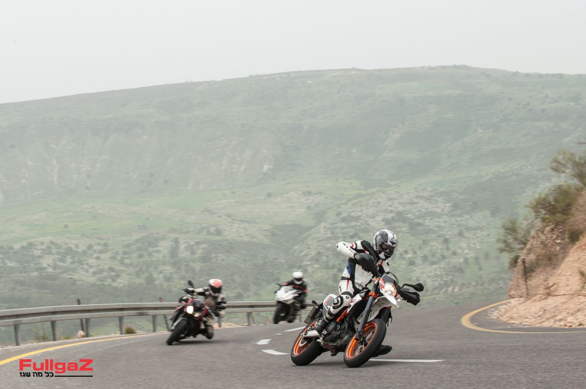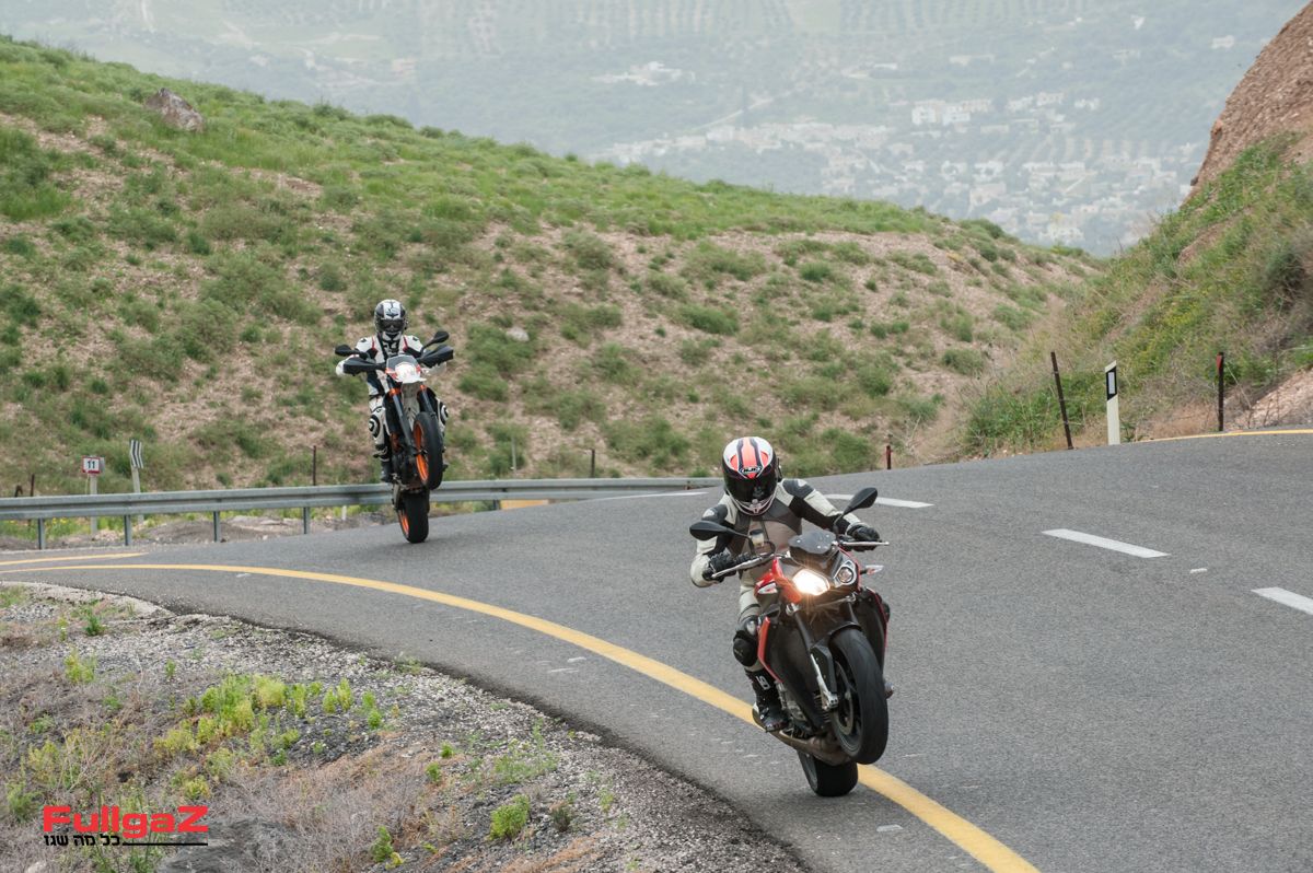 וזה לא שעל הגרמני התאוצות לא היו מרטיבות עיניים, פשוט שעל ה-F3 מה שנרטב זה התחתונים..דכאון. היעד שלנו להיום הוא העליות למבוא חמה – קטע כביש שרק בשבילו היה שווה להתברבר ארבעים שנה במדבר, ואנחנו מתכננים להגיע אליהן דרך כבישים מגניבים ומגוונים בבקעה. הכל טוב ויפה, אבל כרגע אנחנו על כביש 5 הישר והמשמים בואכה שומרון, ואיכשהו אני על הק.ט.מ – מכתיב מהירות זחילה של 140 קמ"ש. הוא קל משקל ויש לו מנוע סינגל שמפמפם כמעט 70 כוחות סוס שיקחו אותו עד בערך 180 קמ"ש, אבל גם תנוחת רכיבה זקופה לחלוטין עם כידון נמוך ורגליות שממוקמות קדימה ולמטה. זה מרגיש קצת כמו לרכב על האסלה המהירה בעולם, ושרירי הבטן הרופסים שלי לא בנויים לזה. לפני שאביעד מסיים להציע שנחליף, אני כבר שוכב רכון על המיכל של ה-F3, מתכנן לעצמי בראש איך להתחמק מהק.ט.מ הספרטני עד שנגיע לקטעים הטכניים ממש, שם ברור לי שאאלץ להשתמש באלימות פיזית מתונה כדי לשכנע את אביעד שיחזיר לי אותו.