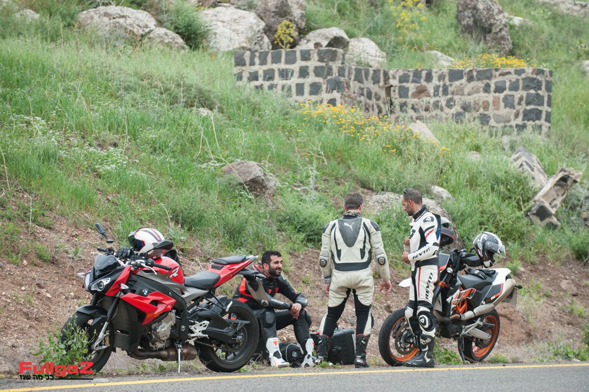אנחנו קצת אחרי צמח, מתקדמים מזרחה. בעוד רגע יתחיל קטע החימום שלפני העליות מחמת גדר אל מבוא חמה. זה קטע מגוון מאוד, טכני, אבל לא צפוף מדי, שכולל פניות מכל הסוגים והמון שינויי כיוון ולא נותן בהכרח יתרון מסוים לאף אחד מהאופנועים. זה אמנם קטע חימום קצר יחסית, אבל מדובר באחד הקטעים המגניבים ביותר בארץ בעיניי. שמאל, ימין, שמאל, ימין – בלי הפסקה, עם אספלט ושיפועים נכונים שמאפשרים לדחוף כמויות של גז, וה-S1000R יוצא מהפניות עם דרייב בלתי נגמר, גלגל שמתרומם כשאנחנו בהטיה שמאלה ונוחת חזרה כשאנחנו כבר נכנסים לפנייה ימינה.