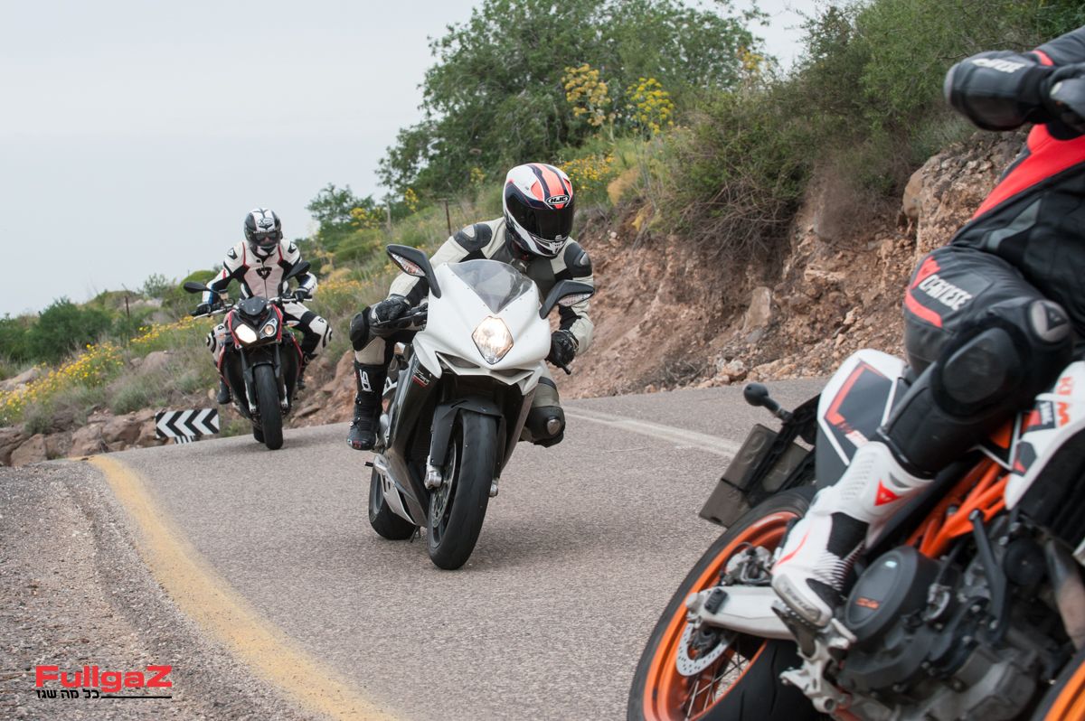 בדרכנו צפונה אל הכנרת, כביש 90 נפתח אל סדרה בלתי נגמרת של סוויפרים ארוכים ומהירים על אספלט מעולה. בדיוק המקום לעזוב את אביעד והק.ט.מ ולתת דרור למנועים שמורידים לכביש 148 כוחות סוס במקרה של ה-F3 ו-160 במקרה של ה-S1000R. אני יושב על הזנב של נמרוד ושומע דרך הסקאלה ריידר PACKTALK איך אביעד מתרחק ומתנתק ואת צעקות האושר של נמרוד שמתורגמות לדרך שבה הוא זז על האופנוע, מרים, מוריד, דוחף. הוא זרע בדמעה כל הדרך וגם עכשיו הוא עובד קשה, אבל סוף סוף הוא קוצר. הוא מתאר לי באוזנייה כל פעולה שהוא עושה ואיך האופנוע מגיב בצורה שהוא לא חווה על אף אופנוע לפני זה. זה גם ניכר בעין ככל שהמהירות והעומסים עולים, ונראה שה-MV אגוסטה יותר ויותר מתיישב לתוך ה'זון' שלו.