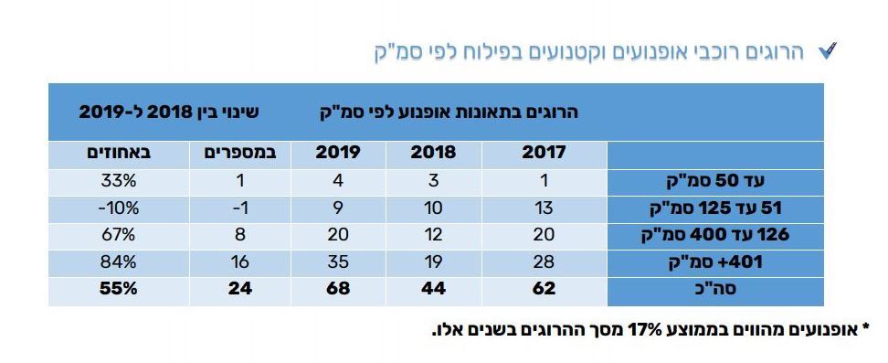 בשנת 2019 נהרגו על כבישי ישראל 68 רוכבי אופנועים וקטנועים, וזאת מתוך 349 בני-אדם שנהרגו על כבישי ישראל בשנה זו – כך עולה מהדו"ח השנתי של הרלב"ד – הרשות הלאומית לבטיחות בדרכים. הנתון הזה של 68 רוכבים הוא הגבוה ביותר אי-פעם, ומהווה עלייה של כ-55% ביחס ל-2018 – אז נהרגו על כבישי ישראל 44 רוכבים. נציין כי בשנת 2017 נהרגו על כבישי ישראל 62 רוכבי אופנועים וקטנועים.