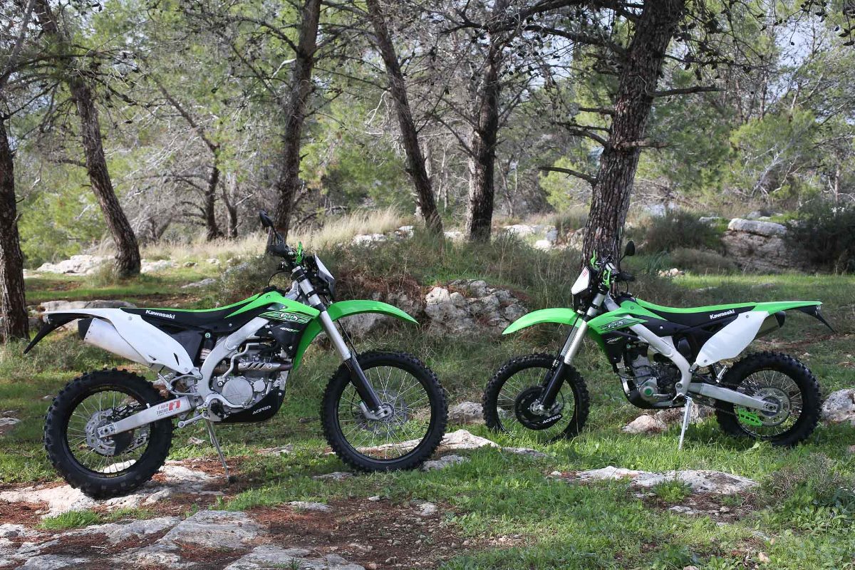 צמד הכלים שפה הם הלכה למעשה אופנועי המוטוקרוס של קוואסאקי – ה-KX250F וה-KX450F, שעברו בסדנת KL האיטלקית וקיבלו תקינת כביש מלאה כדי שיוכלו להימכר כאופנועי אנדורו ויהיה ניתן לרכב איתם לא רק במסלולי מוטוקרוס סגורים אלא גם בשטח פתוח. בארץ זה אומר שהם נמכרים ככלי רכב עם רישוי צהוב ולא ככלי ספורט עם רישוי אפור. במסגרת תקינת הכביש הכלים מקבלים מערכת חשמל ותאורה מלאה, מראות, רגלית צד, לוח שעונים וגלגל אחורי בקוטר "18 במקום "19 במוטוקרוס. המקבילים שלהם הם צמד ה-CRF-R של הונדה, שנמכרים כעת עם תקינת כביש אחרי שעברו בסדנת RedMoto. רכבנו על צמד הכלים בהשקה המקומית שנערכה בתל חדיד, אחרי יממה של כמויות גשם נאות ובתנאי חלקים. אנדורו אמיתי.