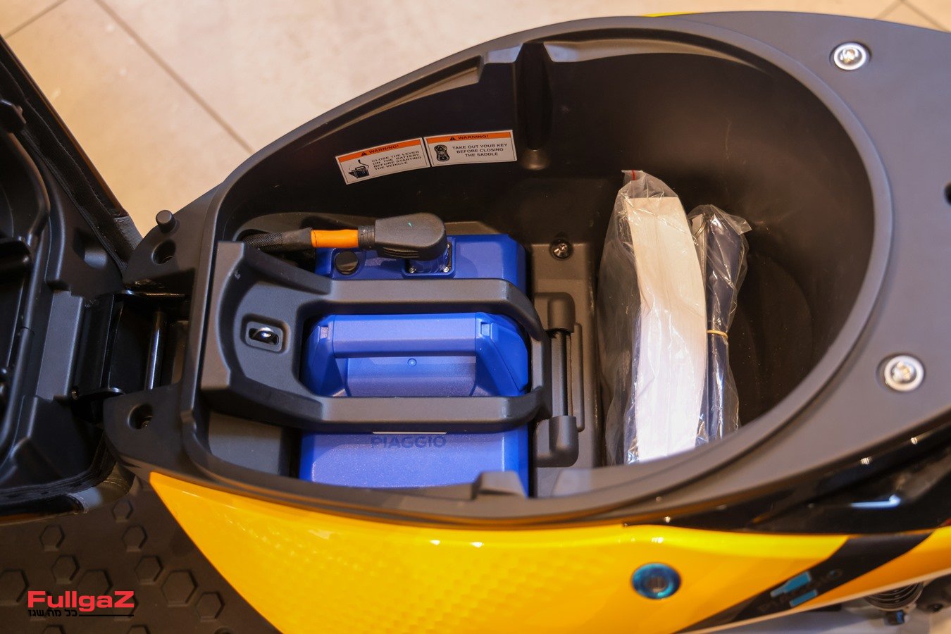 מתחת למושב יש תא אחסון שבו ניתן לאחסן קסדה פתוחה או תיק קטן, אך את עיקר המקום מתחת למושב תופסת הסוללה, שמשקלה 15 ק"ג. לא סוללה קלה, אך בניגוד למתחרים רבים לפחות מדובר פה בסוללה אחת בלבד כך שסך הכל המשקל שיש לסחוב קטן משמעותית ומצריך רק יד אחת. ופה הגיע הזמן לדבר על איך מטעינים את הפיאג'ו 1. למי שיש שקע חשמלי בחניה זה קל ופשוט – מחברים את המטען בצד אחד לחשמל ובצד השני לסוללה, ולא צריך לסחוב כלום. מי שאין לו גישה לחשמל בחניה יצטרך לפרק את הסוללה (פירוק מהיר וקל) ולסחוב אותה אחר כבוד אל השקע והמטען. לבסוף, מי שאין ברשותו נקודה קבועה וירצה לטעון אותה גם בבית וגם במשרד, יצטרך לסחוב גם את הסוללה וגם את המטען. זה אומנם תרחיש נדיר יותר, אך במקרה כזה המטען יתפוס חלק גדול מנפח האחסון מתחת למושב, ויש גם לציין שהוא אינו נוח במיוחד לסחיבה. הוא קל ויש לו ידית נשיאה, אך אין איך לקבע את החוטים משני צידיו ותצטרכו לאלתר בעזרת גומייה או תיק נשיאה.