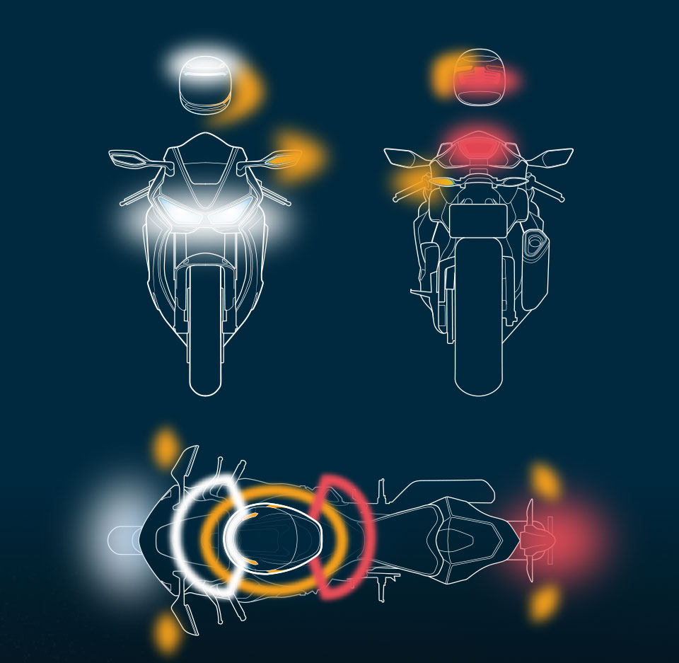 הפיצ'ר המעניין ביותר נועד לשפר את הנראות והראות של הרוכב והאופנוע. בחלקה הקדמי של הקסדה יש תאורת LED קדמית ובחלקה האחורי יש תאורת LED אדומה, אור בלם ומאותתים – כששני האחרונים מסונכרנים דרך תקשורת הבלוטות' לתאורת האופנוע.