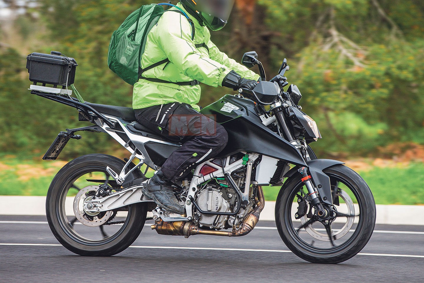 כאמור, יחידת ההינע הורכבה ממנוע LC4, שהיה בזמנו סינגל בנפח 609 סמ"ק עם ארבעה שסתומים, גל זיזים עילי יחיד וקירור נוזל. הזנת הדלק התבצעה דרך קרבורטור דל'אורטו בקוטר 40 מ"מ, ההספק עמד על 55 כ"ס ב-7,000 סל"ד, והמומנט על 6.1 קג"מ ב-5,500 סל"ד, יחד עם גיר של חמישה הילוכים. אחד לאחד מנוע האנדורו, שפשוט עבר לכאן והעביר את שמחת הווילי למיטה אחרת. שימו לב לרגלית ההתנעה בצד שמאל – סימן ההיכר של ק.ט.מ דאז.