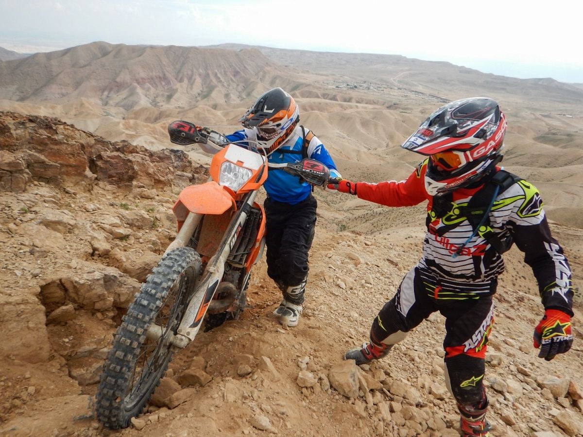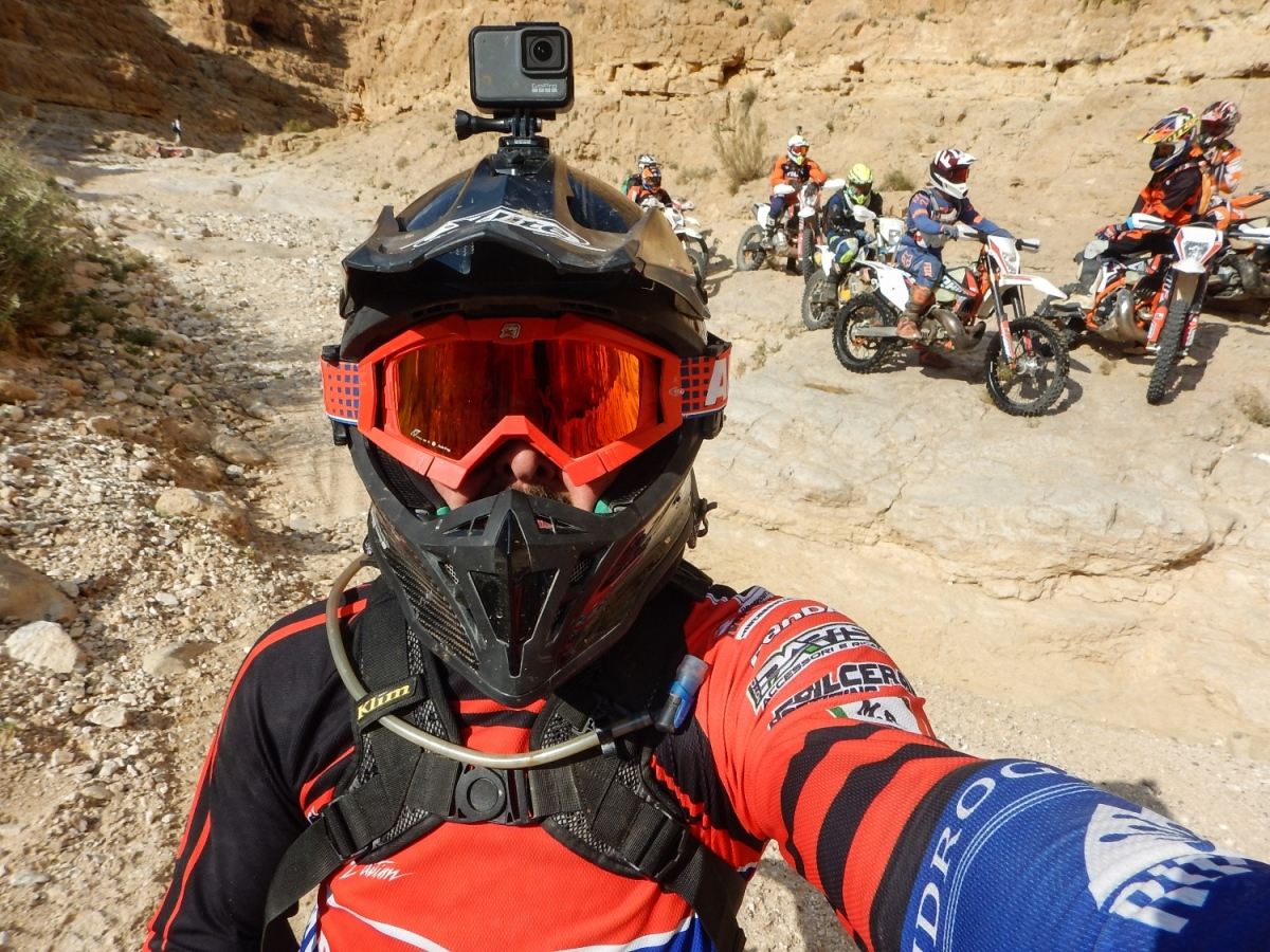 ביום הרכיבה האחרון, אביעד שהיה עסוק במבחן דרכים השאיר אותי בידיהם של זיו ואלעד מ'צ'אמפ פקטורי'. זיו כרמי הוא אחד הרוכבים המובילים בישראל. הוא השתתף כמה פעמים בסיקס-דייז והיה חבר הנבחרת הישראלית במוטוקרוס האומות. זיו ואני נפגשנו ב-2018 כשהשתתפתי ברומניאקס והוא היה המדריך והחונך שליווה את רן יוחאי הצעירה עד לקו הסיום. זיו ואלעד צירפו אותי ליום הדרכת הארד-אנדורו בנחל כמריר, לא רחוק מהעיר ערד שבדרום המדינה. השתתפו בקורס כתריסר רוכבים. רכבנו בתוואי מדברי מרשים, כששני המדריכים עצרו מדי פעם והתעמקו בטכניקה מסוימת תוך אימון על קטעים טכניים אופייניים.