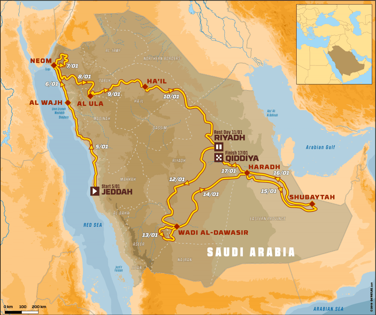 נזכיר שמהדורת 2020 של ראלי דקאר המפורסם תתקיים השנה לראשונה בערב הסעודית. הפרק השלישי בתולדות התחרות, שנקרא ממלכת החולות (THE KINGDOM OF SAND) יוזנק ב-5 בינואר מהעיר ג'דה הנושקת לחוף הים האדום, ויסתיים ב-17 בינואר באל קידיה (Qiddiya), דרומית לעיר הבירה ריאד. ב-11 ימי המרוץ יכסו המתחרים כ-7,900 ק"מ, מתוכם מעל 5,000 ק"מ של קטעי ספיישל מדודים. המארגנים הבטיחו שהחלק הראשון יכלול קטעי ניווט מאתגרים, ואילו חציו השני של המרוץ יורכב מחול, חול ועוד חול. מתוך 351 המתחרים הרשומים ל-2020 יש 170 הרוכבים על אופנועים וטרקטורונים.
