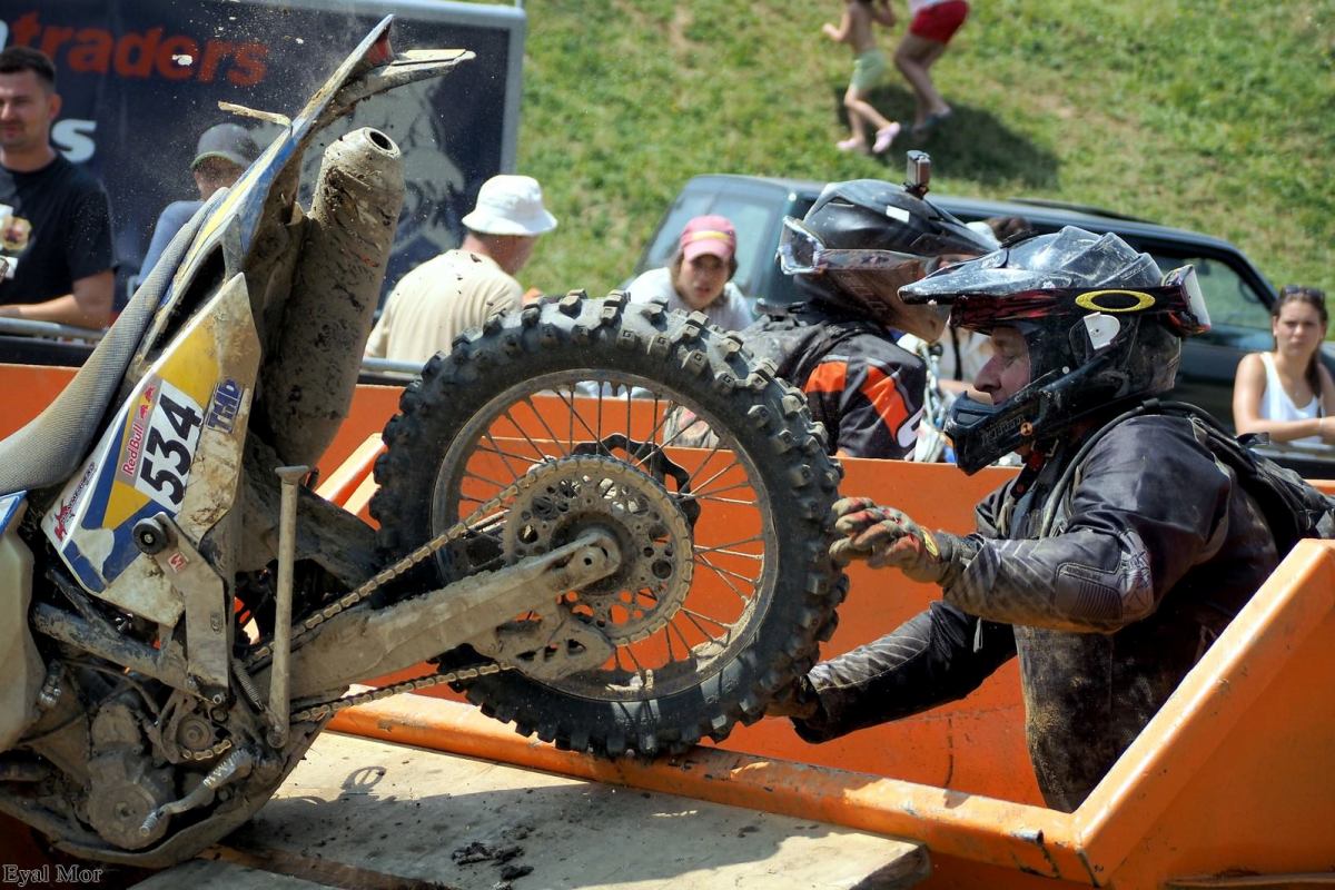 "ביום השלישי, כ-10 ק"מ אחרי נקודת השירות של מחצית היום, ביצעתי מפגש לא מתוכנן עם עץ ששיפד את הרדיאטור בהוסקוורנה TE250 שלי. המים נזלו ורכבתי עם מערכת קירור כמעט ריקה. כדי לשמור על המנוע דוממתי בירידות, ובעליות רכבתי חלש ככל האפשר. כשהגעתי לנקודת הביקורת השישית עצרתי את האופנוע וכבר ראיתי את עצמי פורש מהמרוץ. 10 דקות מאוחר יותר הגיע רוכב אסטוני על ק.ט.מ 300, שכבר עזרנו אחד לשני בשלבים מוקדמים יותר של המרוץ. הוא ירד מהאופנוע והחל להסתובב כסהרורי, לא מוצא את עצמו. המארגנים השכיבו אותו וכיסו אותו בשמיכה, אבל לי היה ברור – זו התייבשות. הפשטתי אותו מציוד הרכיבה ונתתי לו לשתות מים, ואחרי רבע שעה הוא החל להראות סימני חיוניות.