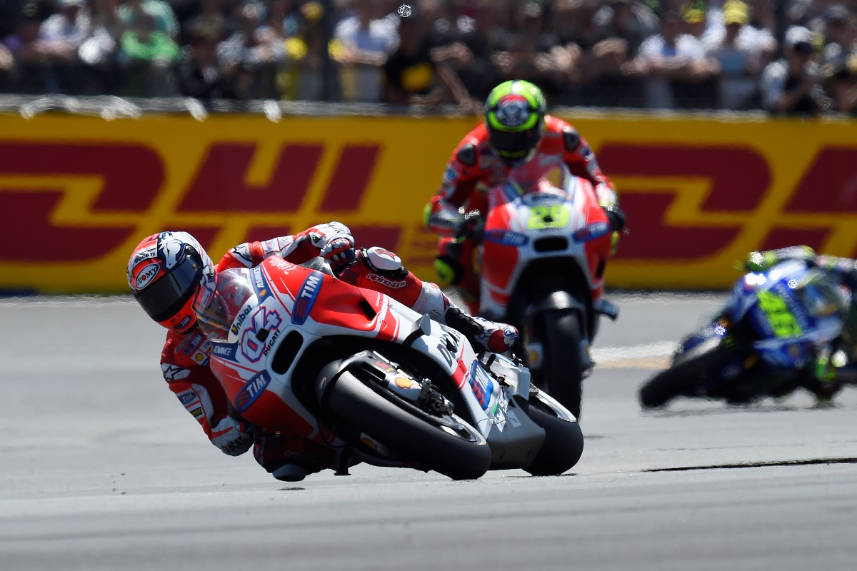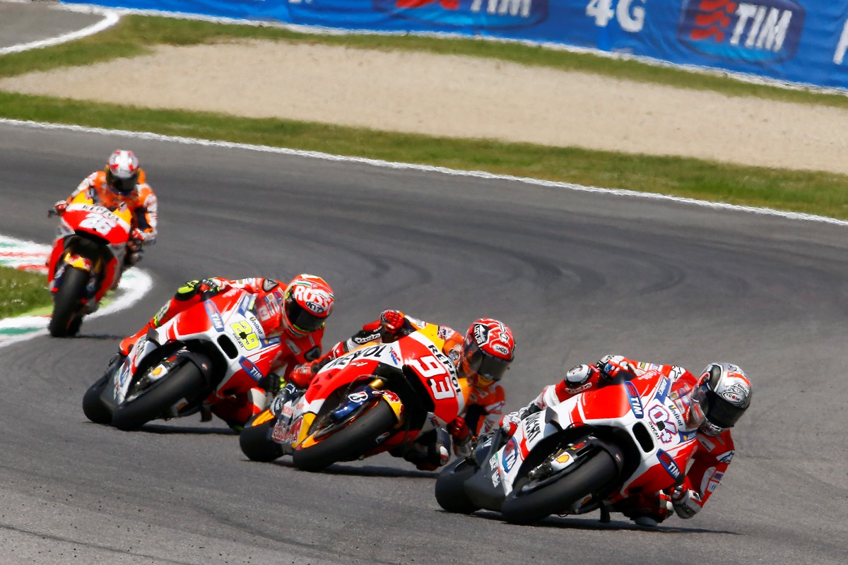דוביציוזו והדוקאטי; מאחור יאנונה, ורוסי לפני שעקף את שניהם
