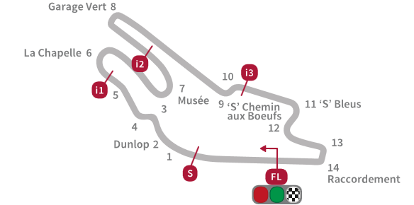 אורכו של מסלול בוגטי 4.2 ק"מ. יש בו 9 פניות ימניות ו-5 שמאליות, מה שמכריח את ברידג'סטון לספק למרוץ צמיגים א-סימטרים על מנת להתמודד עם העומס על חלקו הימני של הצמיג. רוחבו של המסלול 13 מטרים, מה שמכריח את הרוכבים לעקיפות על הבלמים או בלימות מאוחרות וטריקת דלתות בשני השקיינים. הישורת האחורית היא הארוכה מבין שתי הישורות ואורכה 674 מטר. מסלול מהיר וזורם שבו גם הפניות האיטיות הן חלק משטף הרכיבה ואין בו את פניות ה'עצור ותן גז' שכל כך מאפיינות את מסלולי האחות הבכירה – F1.