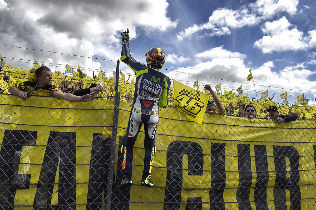 ולנטינו רוסי מנצח באסן בפעם ה-111 בקריירה ומזכיר לכולם למה הוא הגדול מכולם. 1.2 שניות אחריו חוצה את הקו הרוכב החבוט של 2015 – מארק מרקז. הפער בסיום מתעתע ואינו מספר את מהלך המרוץ. רוסי ומרקז, שני הרוכבים המעניינים בסבב, רוכבים ראש בראש לאורך 26 הקפות. במשך רוב המרוץ יהיה זה רוסי שיוביל. שבע הקפות לתום המרוץ מרקז עוקף את רוסי על הבלמים לפנייה מס' 1 ולרוסי אין תגובה מהירה. רוסי צמוד למרקז במשך 4 הקפות ומחליט ללכת על כל הקופה כשהוא נכנס לפנימי בפנייה 10, ולא עוזב את הגז גם בקו החיצוני בפנייה 11. רוסי קובע את ההקפה המהירה שלו במרוץ ופותח פער של חצי שנייה על מרקז. עם כל הזהירות של מרקז לאורך המרוץ, לא רוכב כמרקז יוותר על ניסיון אחרון. הוא מצליח לסגור על רוסי לקראת תום ההקפה האחרונה, ובכניסה לפנייה 16 מרקז בקו הפנימי ורוסי מעט לפניו, אבל שני הרוכבים מהירים הרבה יותר מדי בשביל לסיים את סדרת הפניות שמהן מורכב השיקיין. באפקס בפנייה 16 נוצר מגע בין השניים, ורוסי נאלץ לזקוף את הימאהה, חותך את השיקיין דרך החצץ ומנצח את המרוץ. מרקז מצליח בקושי רב לסיים את השיקיין על האספלט ומאבד 1.2 שניות לרוסי. ניצחון ראשון של רוסי מעמדת הפול משנת 2009, ניצחון שמראה לנו שוב – הדוקטור חזר.