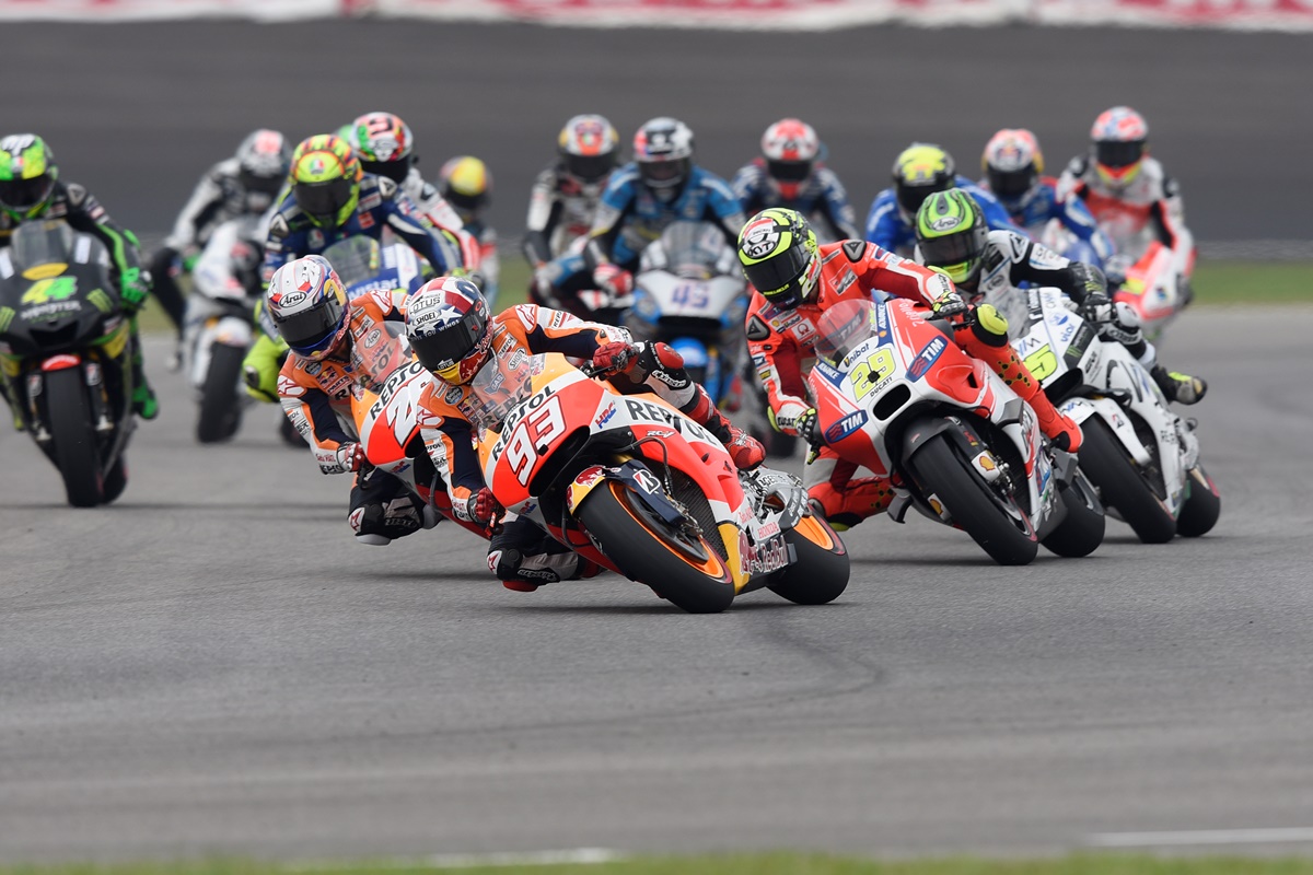 מזנקים למרוץ, וסוזוקי שסובלים מבעיית קלאץ' נשאבים לאחור במהירות האור. גם הריצה הארוכה מקו הזינוק לפנייה מס' 1 לא מועילה לסוזוקי, שנמצאים בחיסרון כוח מנוע וטובעים בים של ימאהות, הונדות ודוקאטים. לורנזו מזנק היישר למקום הראשון ואחריו דובי ומרקז.
